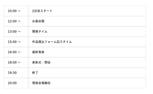 - 2日目の午後に、現地会場とVR会場で参加したすべてのチームによるプレゼンと審査を行います。- VR会場での参加チームはオンラインでの発表および審査となります。