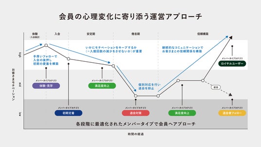 「退会リスク期にはこうアプローチ」など、行動パターンに応じたアクション例も提案。コミュニケーション機能と組み合わせることで、体験・入会・利用継続・退会防止といった会員ライフサイクル全体で最適な対応が可能になります。