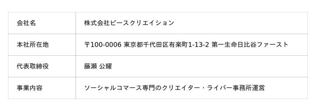 ピースクリエイションは、親会社の株式会社いつも(本社:東京都千代田区、代表取締役社長:坂本守)が13,000件以上のEC・D2Cの総合支援で培ったノウハウと、グループ会社の株式会社ピースユー(本社:東京都千代田区、代表取締役:藤瀬公耀)が提供する日本最大級のライブコマースアプリ「Peace you LIVE」の運営実績や、ライバーとのネットワークを活かした、ソーシャルコマース専門のクリエイター・ライバー事務所です。■株式会社ピースクリエイション