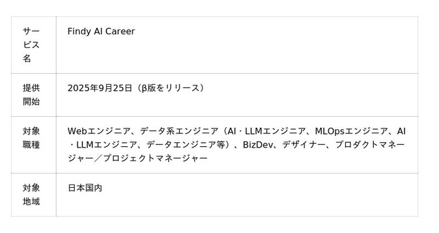 エンジニアプラットフォームを提供するファインディ株式会社(東京都品川区、代表取締役:山田 裕一朗、以下「当社」)は、生成AI活用レベルを「偏差値」として数値化するAI人材に特化した転職サイト「Findy AI Career」のβ版を2025年9月25日より提供開始することを発表いたします。提供開始することを発表いたします。本サービスは、2025年7月にリリースした「Findy AI Career」α版(参考URL:https://findy.co.jp/3146/)に、求職者の生成AI活用レベルを客観的に数値化する「生成AI偏差値測定機能(※1)」を新たに搭載しました。さらに、掲載求人のほとんどが生成AI関連に特化しており、生成AI時代に即したまったく新しい転職支援サービスです。