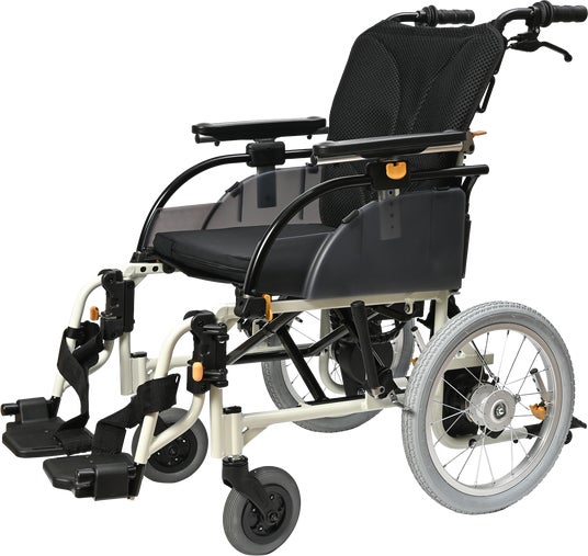 車いすを介助する方が軽い力で押すことのできる電動車いすです。