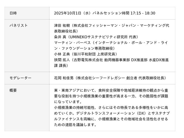 開催初日の10月1日(水)には、「小規模漁業の未来を描く-DXとサステナブル金融の力」をテーマに当社の社員がパネルセッションに登壇します。【演題:小規模漁業の未来を描くーDXとサステナブル金融の力】