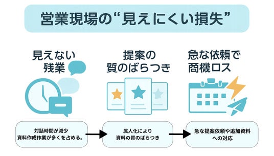 営業部は企業の売上を支える最前線ですが、その成果を最大化する環境は整っていないことが多くあります。「営業力低下」は商談スキルや競合環境だけの問題と思われがちですが、実際には日々の業務に潜む“見えない損失”が原因となり、受注率や売上成長を阻害しています。資料作成の負荷、品質のばらつき、急な依頼への対応遅れといったこれらは数字に表れにくいものの、営業成果を着実に削っています。