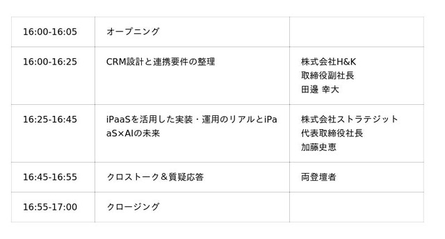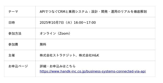 株式会社ストラテジット(本社:東京都港区、代表:加藤 史恵、以下当社)は、株式会社H&K(本社:東京都中央区、代表:安藤 弘樹、以下)と共催で、CRMと業務システムのAPI連携・iPaaS活用をテーマとした無料ウェビナーを2025年10月7日(火)に開催いたします。