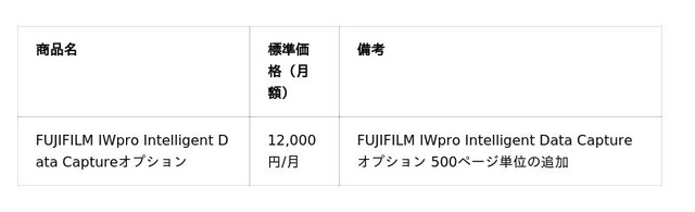 「FUJIFILM IWpro Standard」または「FUJIFILM IWpro Light」 のライセンスをご契約のお客様は、「FUJIFILM IWpro Intelligent Data Captureオプション」を月間100ページまで無償で利用可能です。月間101ページ以上ご利用の場合は、「FUJIFILM IWpro Intelligent Data Captureオプション」の契約が必要です。