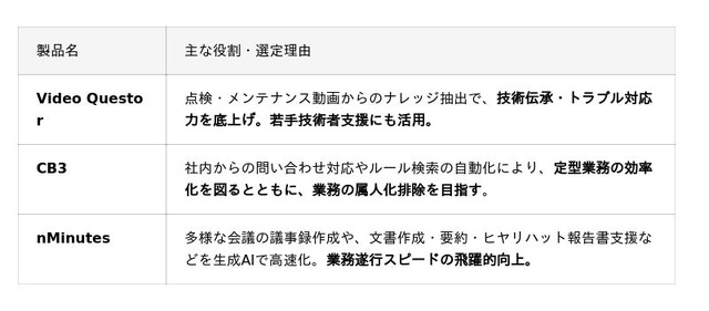 これらの課題に対応するため、2025年より「社内業務向けDXプロジェクト」を始動。ナレッジの可視化や集積、属人化の排除と業務標準化の推進を最優先テーマに掲げ、段階的なデジタル化を進めています。特に、データ活用やナレッジ共有の高度化に加え、生成AIの実用性にも着目し、日々の意思決定や対応力の強化を模索しています。