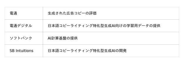 株式会社電通(本社:東京都港区、代表取締役 社長執行役員:佐野 傑、以下「電通」)、株式会社電通デジタル(本社:東京都港区、代表取締役社長執行役員:瀧本 恒、以下「電通デジタル」)、ソフトバンク株式会社(本社:東京都港区、代表取締役 社長執行役員 兼 CEO:宮川 潤一、以下「ソフトバンク」)およびSB Intuitions株式会社(本社:東京都港区、代表取締役社長 兼 CEO:丹波 廣寅、以下「SB Intuitions」)は、日本語特有の語感や繊細な表現を捉えた“心を動かす日本語の広告コピー”を生成する「日本語コピーライティング特化型生成AI」の開発に向けて、2025年9月25日に共同研究を開始します。この共同研究により、誰もが手軽に質の高い広告コピーを活用できると共に、クリエイターが発想をさらに広げ、より創造的な表現を生み出せるようにすることを目指します。
