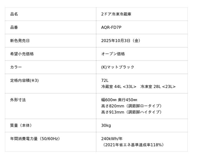 アクア株式会社(本社:東京都中央区、代表取締役社長 兼 CEO:杜 鏡国)は、家具のような佇まいでインテリアと調和するデザインの2ドア冷凍冷蔵庫、家具冷蔵庫「LOOC(ルーク)」(品番:AQR-FD7P)の新色「(K)マットブラック」を、2025年10月3日(金)より発売いたします。