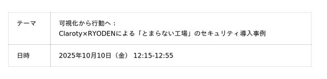 株式会社RYODENは、2025年10月10日(金)、グランフロント大阪にて開催される、情報セキュリティに関する専門イベント「Security Days Fall 2025 Osaka」にパートナーであるClaroty, Ltd.(以下、「Claroty社」)と共に出展いたします。