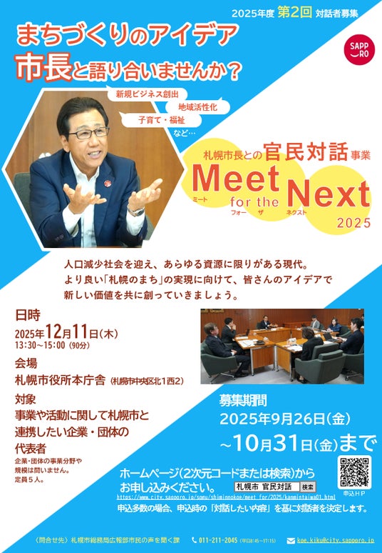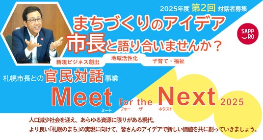 新しい「官民連携」を共に創っていくため、札幌市長がさまざまな企業・団体の代表者等と意見交換を行う官民対話事業「Meet for the Next 2025」。8月に行った第1回に続き、現在、第2回の参加エントリーを受付中です!