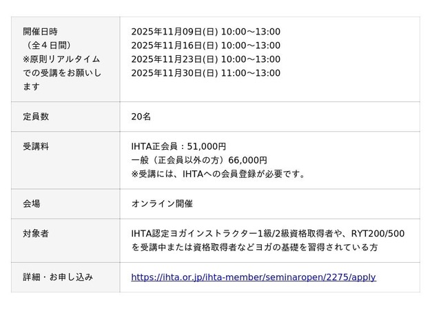 一般社団法人 国際ホリスティックセラピー協会※(事務局:東京都千代田区、代表理事長:高橋 健介、以下 IHTA)は、2025年11月9日(日)より4日間、オンラインにて宝塚歌劇団の娘役として活躍した美都くらら氏が講師を務める『小顔フェイシャルヨガ インストラクター養成講座』を開催いたします。