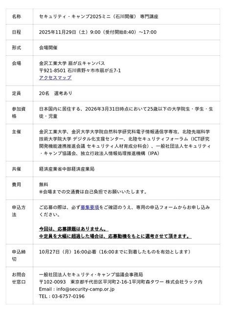イベント詳細:https://www.security-camp.or.jp/minicamp/ishikawa2025.html