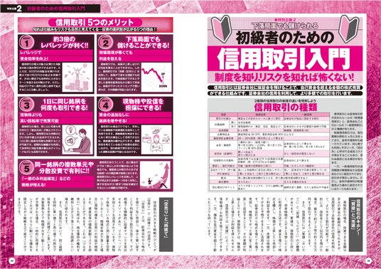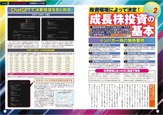特別企画では、初級者向けの「指標、財務の基本」、そして「信用取引入門」「クロス取引」など裏技も伝授。基本的にわかりやすさを志向しましたが、信用取引は中~上級者になってから手をつけましょう。また同時に、テキストAI(ChatGPTなど)を使った情報整理術を掲載しました。