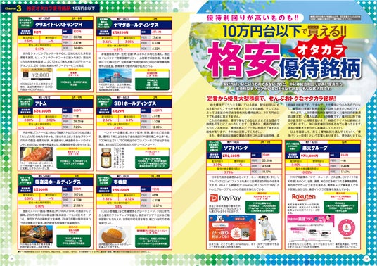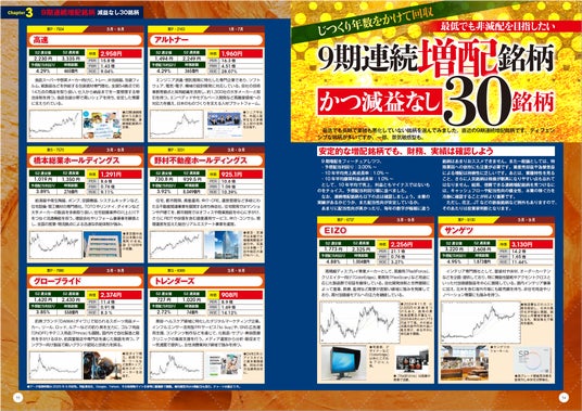 配当銘柄と優待銘柄を仕分けして紹介。直近3ヵ月の優待関連ニュース、20万円以下で買える優良配当銘柄高配当ランキング、10万円以下で買えるおいしい優待銘柄、そして9期連続増配、低PBR好配当、財務健全安全中大型銘柄と、さまざまな切り口でチョイス。
