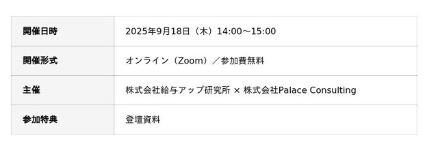 2025年9月18日(木)、株式会社給与アップ研究所と株式会社Palace Consultingの共催によるオンラインセミナー 「不動産業界特化!『採用』と『業務改善』で人と組織を強くする最新手法」がZoomウェビナーにて開催されました。