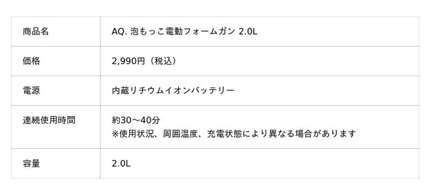 ■ 「AQ. 泡もっこ電動フォームガン2.0L」は、カーシャンプーの泡を電動で噴射でき、洗車をよりラクに快適に