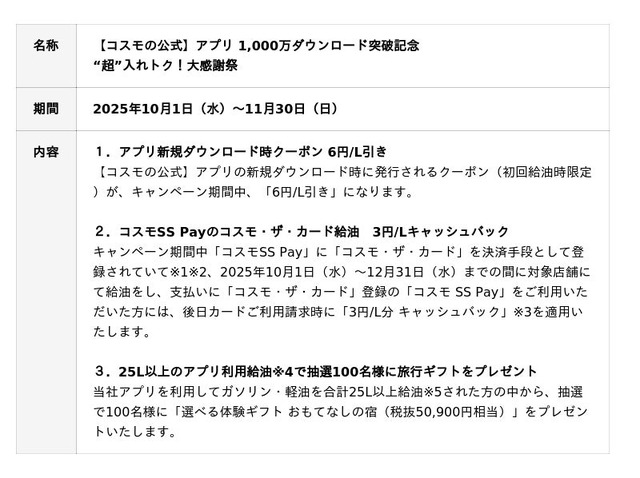 ※4 アプリ利用で給油とは、アプリのQR値引きコードをかざした給油、もしくはコスモSS Payでの給油を指し、いずれの給油方法でもキャンペーンの対象になります。