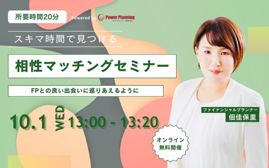 無料マネーセミナー提供サービス「アットセミナー」を運営しているパワープランニング株式会社が「10月1日(水) 13時」に「相性マッチングセミナー」というスキマ時間で自分に合ったFPを見つけられるオンラインセミナーを開催いたします。