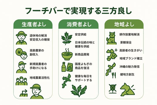 このプロジェクトは、近江商人の「売り手よし、買い手よし、世間よし」の理念を現代の農業に応用しています。沖縄のよもぎ「フーチバー」を軸として、関わるすべての人が利益を享受できる仕組みを構築しています。
