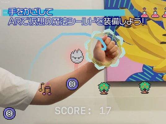 手をかざすだけで金色のバーチャルリングが手首に出現。オンデバイスAIが手の位置を追跡し、絵文字をキャッチしてスコアを競う「Pixel Ninja」。体験時間:約2分/回、iPad 2台をご用意。