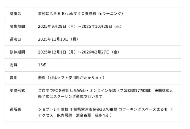 eラーニング型のため、基本的には自分のライフスタイルに合わせて受講が可能です。ただし、開講式と修了式は富津市金谷の訓練校で実施されますのでスケジュールの調整が必要です。即戦力となるスキルを身につけ、早期就職を目指しましょう!