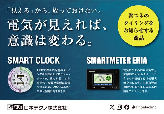 当社のブースでは、電気を『見える化』・『理解(わか)る化』する『SMARTMETER ERIA』(モニター)や『SMART CLOCK』(時計)を展示し、ビジネスシーンで実現する無理のない『上手な電気の使い方』をご提案します。