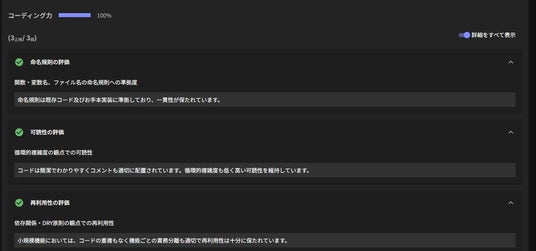 これらの定量評価に加え、生成AIによる定性的な評価コメントを含むレポートが、自動で出力されます。