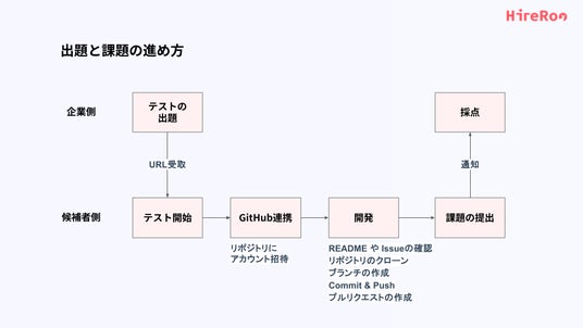 「実践形式」は、候補者がGitHubリポジトリをクローンし、指定された課題要件をもとにコードの実装・修正を行いプルリクエストとして提出する、コーディングテストの出題形式です。従来の「HireRoo Skill Interview」サービス上のエディタ画面内で解答するのではなく、実務に即した開発プロセスを通じて、エンジニアの実力をリアルに評価します。