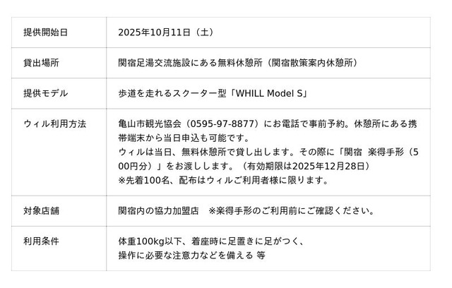 一般社団法人 亀山市観光協会(事務局長:本間一也、以下「亀山市観光協会」)とみえシニアカーレント(本社:三重県鈴鹿市、代表:古市丈法)は、秋の行楽ニーズが高まる時期に合わせて2025年10月11日より、WHILL株式会社(本社:東京都品川区、代表取締役社長 CEO:杉江理、以下「WHILL社」)が開発した免許不要で歩行領域を走行できる近距離モビリティWHILL(ウィル)の移動サービスを導入することを発表いたします。併せて、ウィル貸し出し時に、関宿エリアに点在する商店や飲食店などで使える「関宿 楽得手形(買い物券)」を発行します。日本の伝統的な景観を保全しながら、誰もが快適かつ“お得に”移動可能なアクセシビリティ環境を整える地域ぐるみの新サービスを通じ、関宿の回遊性向上と観光経済活性につなげてまいります。