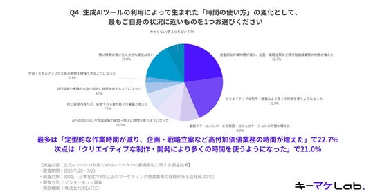 最多は「定型的な作業時間が減り、企画・戦略立案など高付加価値業務の時間が増えた」で22.7%。次点は「クリエイティブな制作・開発により多くの時間を使うようになった」で21.0%という結果になりました。