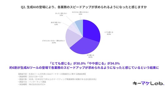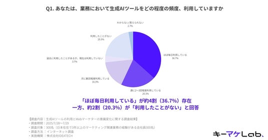 株式会社ベクトル(本社:東京都港区、代表取締役会長兼社長 CEO:西江 肇司、東証プライム:6058)の子会社である株式会社キーワードマーケティング(本社:東京都港区、代表取締役社長:瀧沢 貴浩)が展開するメディア「キーマケLab(読み:キーマケラボ)」は、日本在住で3年以上のマーケティング関連業務の経験がある会社員300名を対象に、生成AIツールの利用とWebマーケターの意識変化に関する調査を実施いたしました。