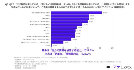 ■Q5.【「あなたは、業務において生成AIツールをどの程度の頻度、利用していますか」という質問に対して、「ほぼ毎日利用している」「週に2~3回程度利用している」「月に数回程度利用している」と回答した方のみに質問】生成AIツールの利用によって、ご自身の業務スキルの中で低下したと感じるものがあれば教えてください(複数回答)