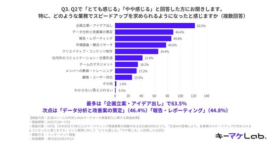 最多は「企画立案・アイデア出し」で63.5%。次点は「データ分析と改善案の策定」で46.4%、「報告・レポーティング」で44.8%という結果になりました。