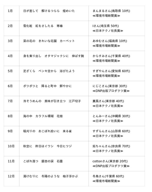 電気に関するトータルエネルギーソリューションサービスを提供する日本テクノ株式会社(本社:東京都新宿区、代表取締役社長:馬本英一、以下、日本テクノ)では、エコカレンダーキャッチコピー募集キャンペーンにご応募いただいた6,656名、29,260作品のなかから2026年版のエコカレンダーに掲載する12の採用作品を発表しました。