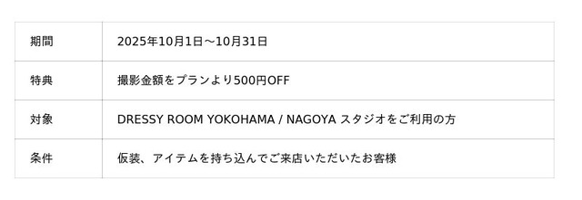 セルフ写真館 PICmiiは、カメラ専門店「カメラのキタムラ」のグループ会社として、撮影画質の仕上がりにこだわったセルフ写真館で、個室での自由な撮影をお楽しみいただけます。DRESSY ROOM YOKOHAMA/NAGOYAスタジオでは、10月限定で『ハロウィンキャンペーン』を実施。10月31日はハロウィン。 仮装、アイテムを持ち込んでご来店いただいたお客様には、撮影金額をプランより500円OFFにてご案内させていただきます。※ご予約時・ご来店時に「キャンペーンの記事を見た」とお伝えください。