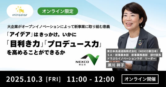 「社内起業家(イントラプレナー)をスターにする」ことをパーパスに掲げる共創コミュニティ「Intrastar(イントラスター)」は、「大企業がオープンイノベーションによって新事業に取り組む意義「アイデア」はきっかけ。いかに「目利き力」「プロデュース力」を高めることができるか」を2025年10月3日(金)に開催いたします。