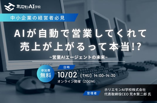 ホリエモンAI学校株式会社(本社:東京都新宿区、代表取締役CEO:荒木 賢二郎)は、2025年10月2日(木)14:00より、「AIが自動で営業してくれて売上が上がるって本当!?営業AIエージェントの未来」 と題したオンラインセミナーを開催いたします。