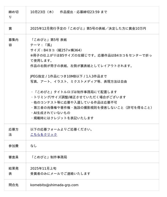 シマダグループ株式会社(本社:東京都渋谷区/代表取締役:島田成年)は自社で発行するブランド冊子「こめびと」の表紙を決定するデザインコンテストを開催いたします。応募期間は10月23日(木)23:59まで。採用された作品の応募者には賞金10万円を贈呈いたします。