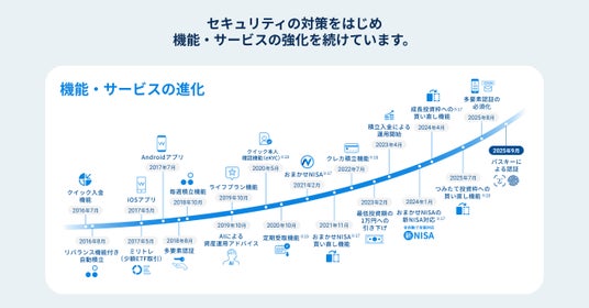 NISA(少額投資非課税制度)の非課税メリットを活用しながら資産運用が行える「おまかせNISA」、資産運用の目標達成をサポートする「ライフプラン」、少額でも最適なポートフォリオを実現する「ミリトレ(少額ETF取引機能)」など多彩な機能で、お客様の快適な資産運用を応援します。「リバランス機能付き自動積立」、「自動税金最適化(DeTAX)機能※」は、中核となる技術について特許を取得しています。