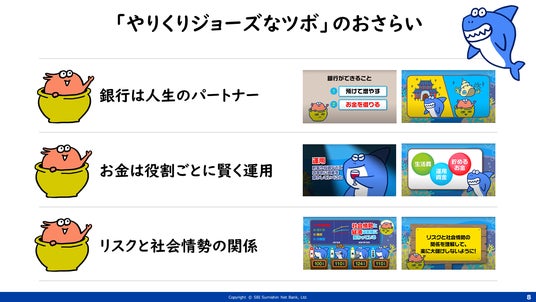 住信SBIネット銀行は、金融経済教育をサステナビリティ重点項目の主な取組みの一つとして位置づけ、取り組んでおります。お客さまの様々なライフステージに寄り添い、引き続き幅広い学びの機会を提供することで、次世代を担う子どもたちの育成を後押ししてまいります。