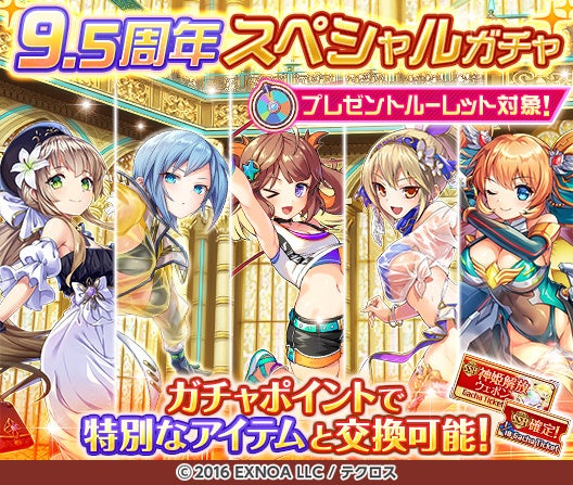 リリース9.5周年キャンペーンとして、毎日最高100連無料ガチャが当たるプレゼントルーレットを開催します!