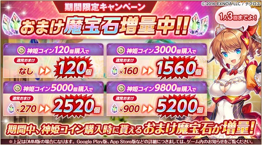 期間中に対象の神姫コインを買うと、おまけの魔宝石がいつもより多くもらえるお得なキャンペーンです。