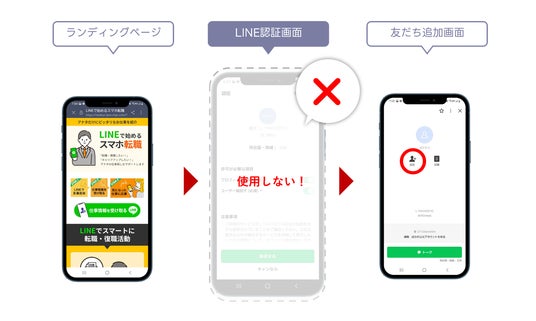 1. 認証画面をスキップユーザーはLINEログイン(認証画面)なしで友だち追加が可能となるため、認証画面によって発生していたユーザーの離脱を解消できます。