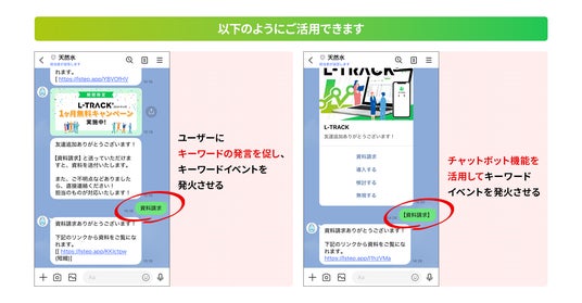 LINEトーク上でユーザーが入力したキーワードを成果イベントとして計測ができます。例えば「資料請求」「購入」「予約」といった発言をトリガーに、従来は「友だち追加」で終わっていた計測を、トーク内のコンバージョン地点まで計測することが可能になりました。さらに、この成果を各広告媒体にコンバージョン連携できるため、どの媒体・どのクリエイティブから成果が発生したのかを正確に把握でき、広告媒体の最適化やCPA改善が可能です。