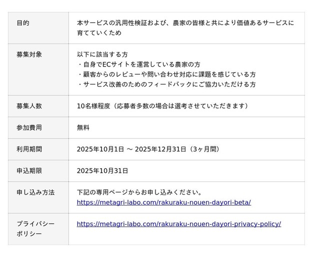 そこで、農業×新技術を推進するコミュニティ「Metagri研究所(運営会社:株式会社農情人)」は、農家専用AIアシスタント「らくらく農園だより」の実証実験を開始します。本サービスは、スマホでレビューをスクリーンショットするだけで、10秒で心のこもった返信文を自動生成します。農作業の合間に、アプリ不要でご利用いただけます。本日より3ヶ月間無料でご利用いただくテストユーザーを【10名様限定】で募集します。