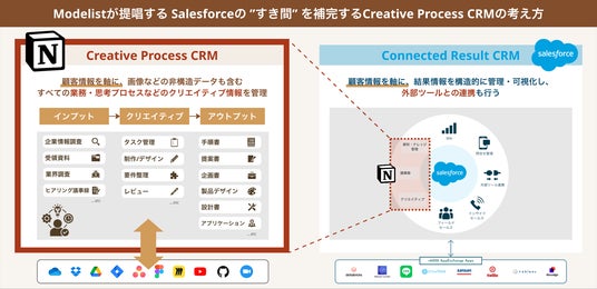 株式会社Modelistは、Notion CRMテンプレートの開発・提供を通じて組織全体の情報管理・ナレッジ管理を高度化し、売上や成果の向上につながる環境づくりを提案しています。近年、多くの企業でSalesforceが導入されていますが、Salesforceで記録できるのは商談結果や受注件数といった“結果”が中心であり、企業調査、ヒアリング、ディスカッションなど提案に至るチームの協業プロセスまでは記録の型がなく、記録をルール化している企業はほとんどありません。こうした「結果は残るがプロセスが見えず、組織全体におけるビジネス結果の再現性がない」という課題をNotion CRMが補完します。