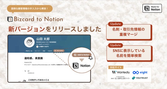 株式会社Modelist(本社:東京都、代表取締役:呉縞慶一)は、会社名や氏名、役職、メールアドレスなどの顧客情報/取引先情報を1クリックでNotionデータベースに追加できる「Bizcard to Notion」の最新バージョンをリリースしました。