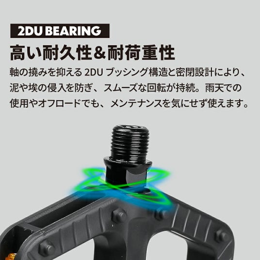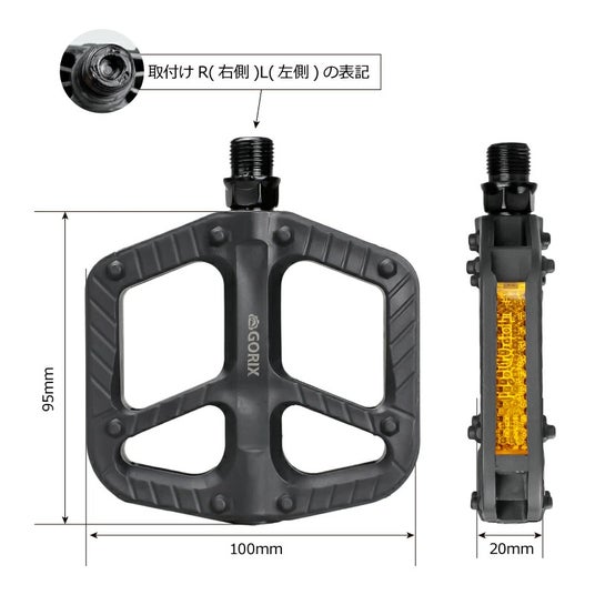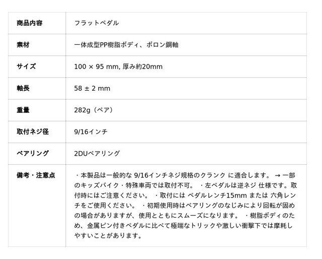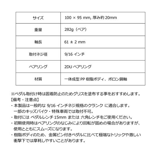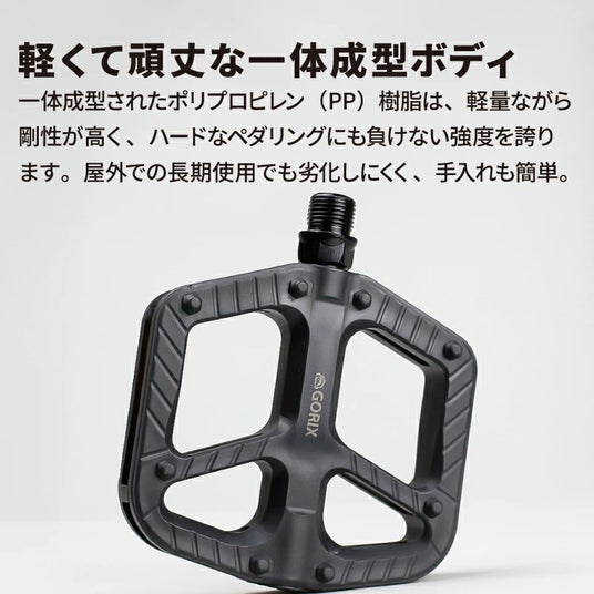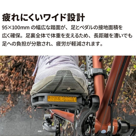 耐久性のある一体成型PPボディは、軽量でありながらも強いペダリングにも負けないタフさを実現し、95×100mmのワイドな踏面は足裏への負担を軽減し、長時間ライドも快適に楽しめます。