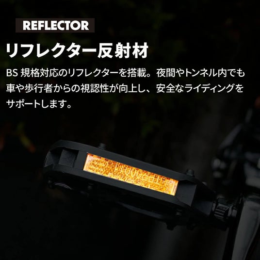BS規格対応のリフレクターを搭載し、夜間やトンネル内でも車や歩行者からの視認性が向上し、