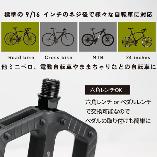 一般的な9/16インチネジ規格を採用し、MTB・BMX・クロスバイク・E-BIKEなど幅広い自転車に